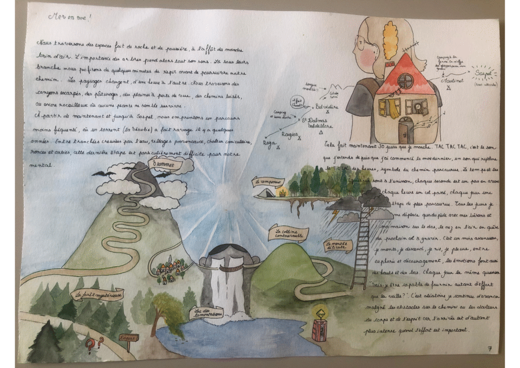 Puis on s’est attablées. Elle m’a donné quelques feuilles, en me disant : « Tiens, je t’ai imprimé ça ». C’est le récit de son aventure à vélo en Ardèche – j’aurais bien aimé qu’elle dure des pages et des pages. Puis elle m’a montré son journal rédigé sur le GR5. Ça m’a rappelé à quel point il était important de garder ce genre de souvenirs. Les lieux traversés, les personnes rencontrées, les émotions éprouvées. Voici quelques extraits de son aventure.
