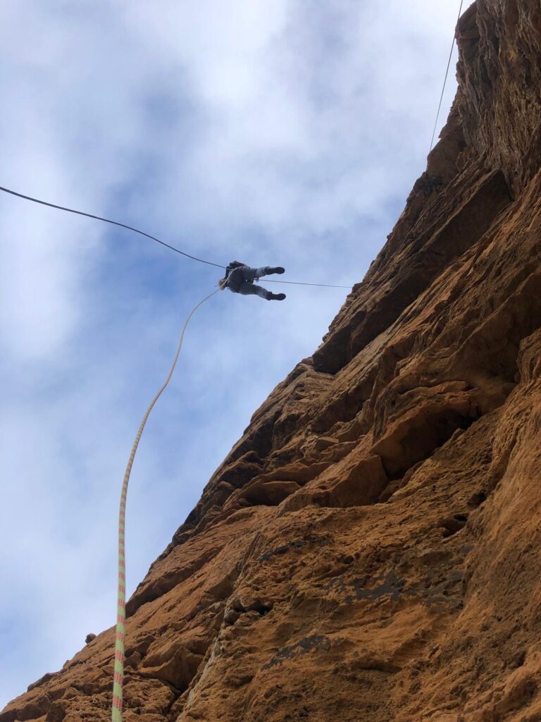 Jour 3. Direction Cap Canaille pour la journée. On part du centre-ville, cette fois pour une marche d’approche un peu plus courte, environ 1h30. On grimpe sur la voie Bourreur de Rousse. L’ambiance est absolument impressionnante, un peu comme dans le Wadi Rum, en Jordanie, avec des falaises rouges et une immensité à couper le souffle. Ce jour-là, la falaise est pleine de grimpeurs, et il y a aussi pas mal de touristes au sommet. On s’est fait des copains de grimpe au relais. On a fini la journée à dîner ensemble le soir. Le fait de venir à pied crée tout de suite des liens, et la conversation s’engage naturellement.