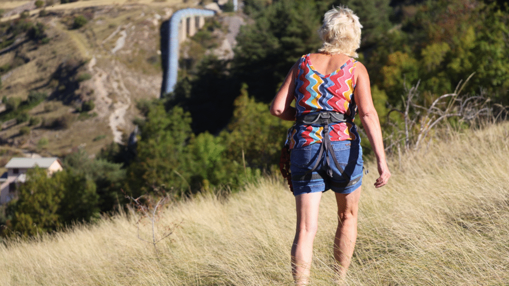 À 65 ans, Jayne cavale dans la via ferrata des gorges du Durance. Elle cavale parce qu’elle a de plus en plus l’habitude de la verticalité. Et qu’elle n’a pas peur, ou elle la maîtrise vraiment bien, cette appréhension du vide.